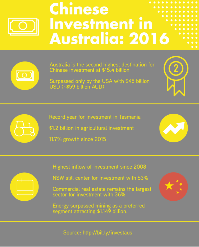 In 2016, Chinese investment in Australia was an incredible $15.4 billion (AUD). This is the highest rate of investment since the global financial crisis back in 2008. A recent report from KPMG and the University of Sydney’s China Studies Centre has shown how Chinese investment in Australia is at an all time high of $118 million total new investment since 2007.